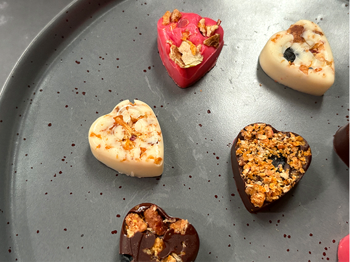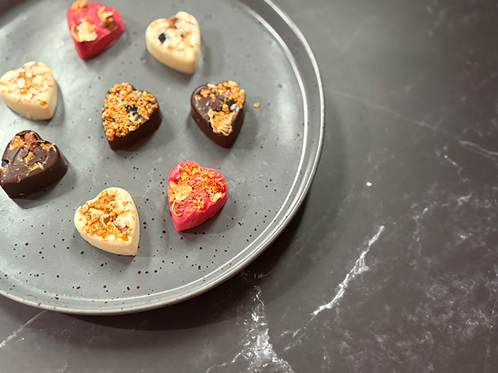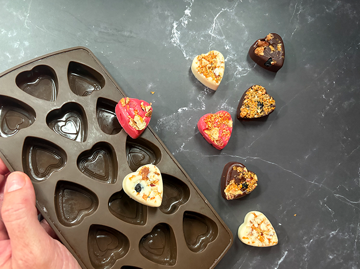 Keeping with the Valentine’s Day theme, using heart shape silicon moulds. These make for effortless de-moulding of your chocolates. When it comes to flavour combinations, get creative and mix things up. Use your loved one’s favourite chocolate be it white, milk or dark chocolate.