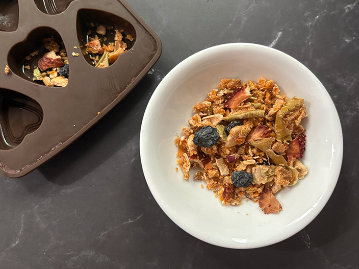 3. Sprinkle the 100% Australian Dried Shredded Fruit into the mould to make a layer in the bottom of the mould.