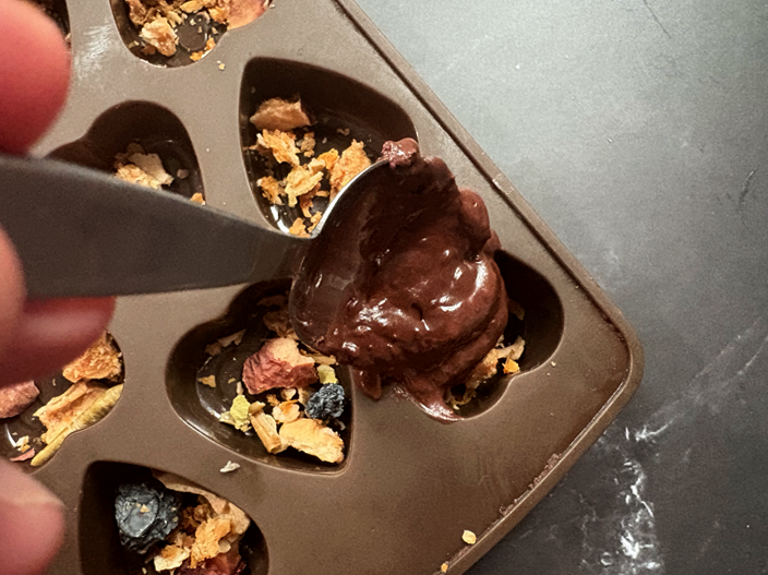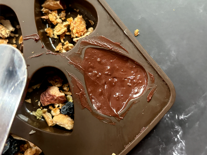 4. Spoon in the melted chocolate over the top of the dried fruit and wipe the chocolate level with a pallet knife. It helps to then gently lift and tap the mould down to help the chocolate to settle into the mould.
