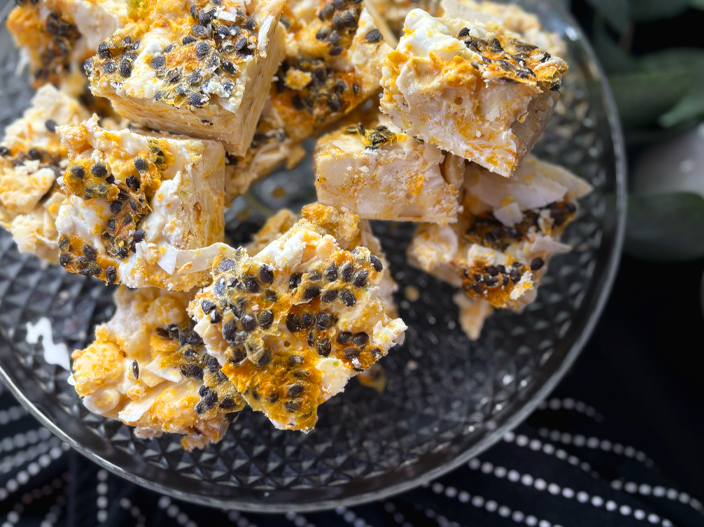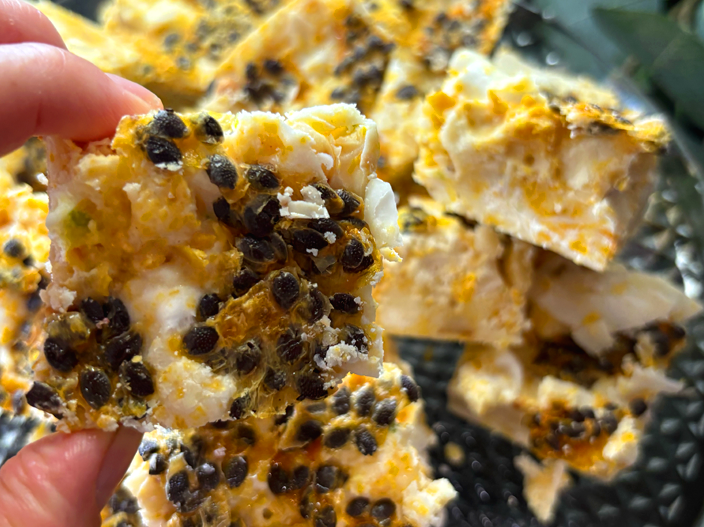 7. Scatter on top the dried passionfruit pieces and press them gently into the mix.